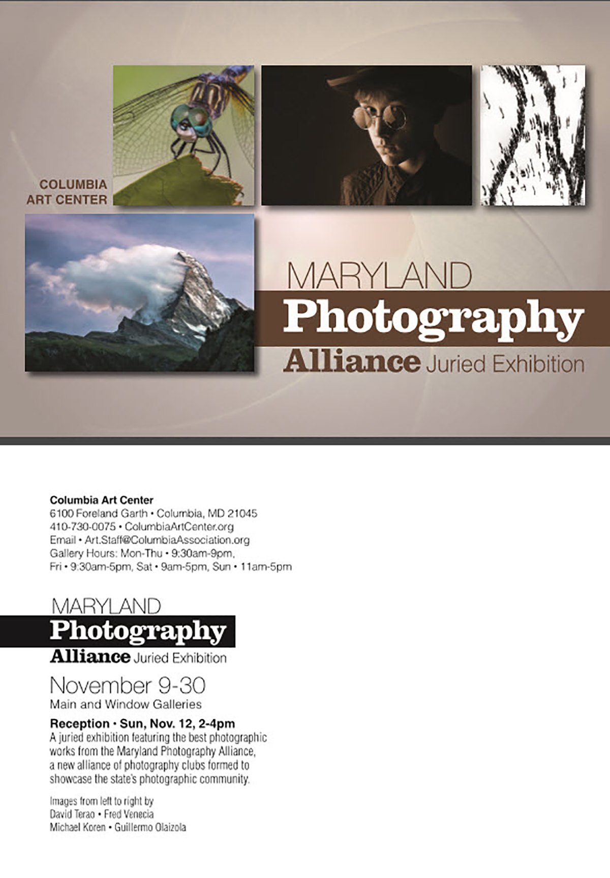 An opening reception is taking place on Sunday, November 12 from 2-4pm. We hope you will be able to attend to view images from very talented photographers in Maryland.