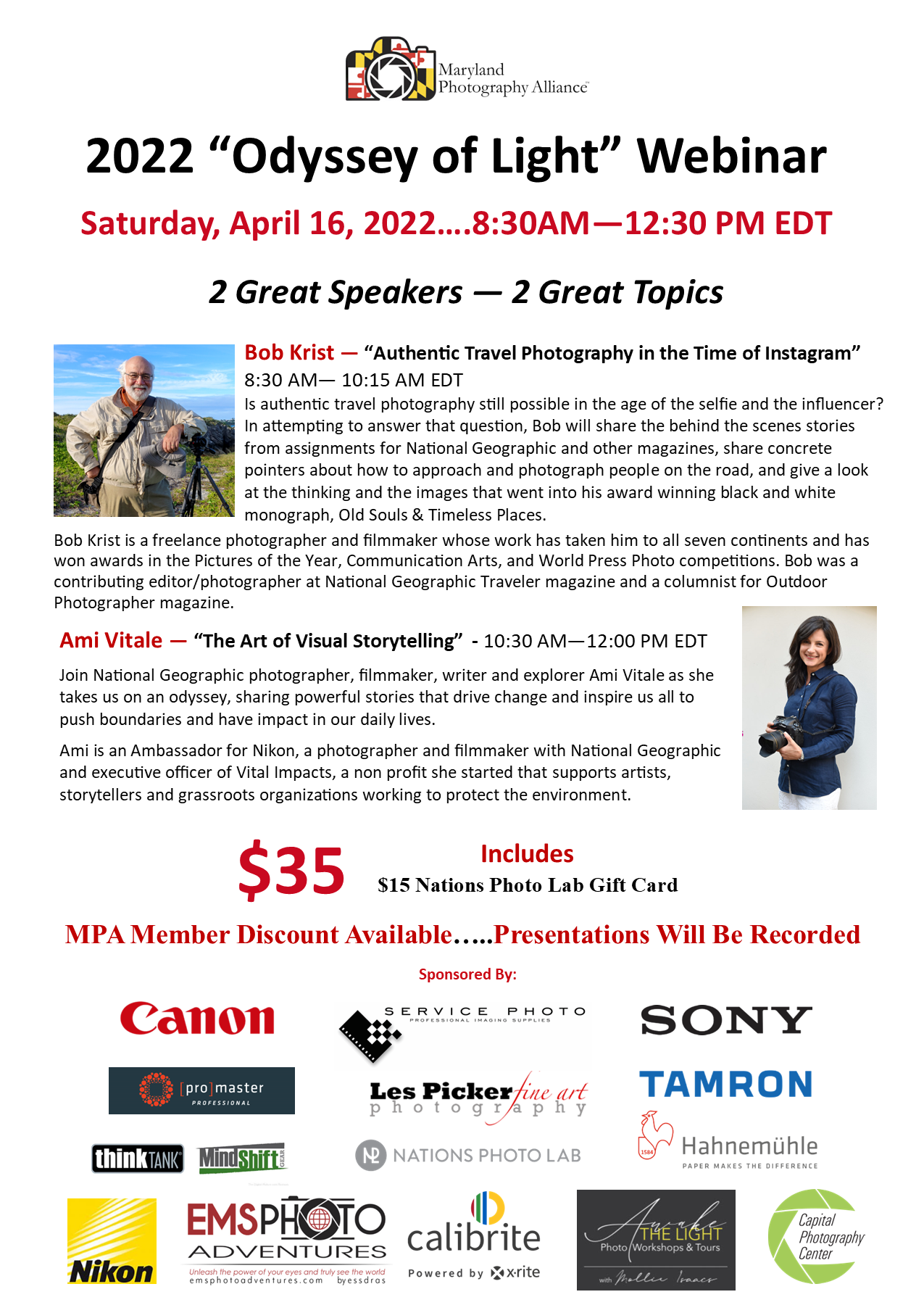 2022 Apr. 16: MPA – Odyssey of Light 2022March 12, 2022Uncategorized0 Source: Odyssey of Light 2022 — Maryland Photography Alliance Share this post PREV2022 Mar. 17: Digital Contest – Open NEXT2022 Jun. 25: How to Hunt – With a Camera – Jug Bay Wetlands Sanctuary – Barbara Saffir